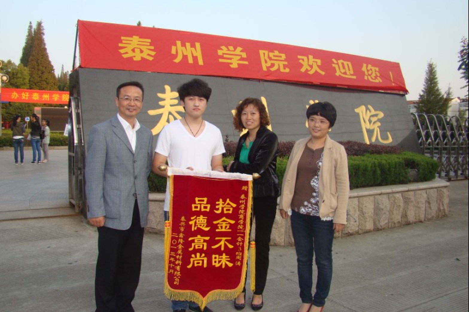 10月21日下午,泰兴市鑫隆金属材料有限公司会计张国辉女士将一面绣有“拾金不昧,品德高尚”的锦旗送到公司,向公司11会计3班周涛同学表示感谢。