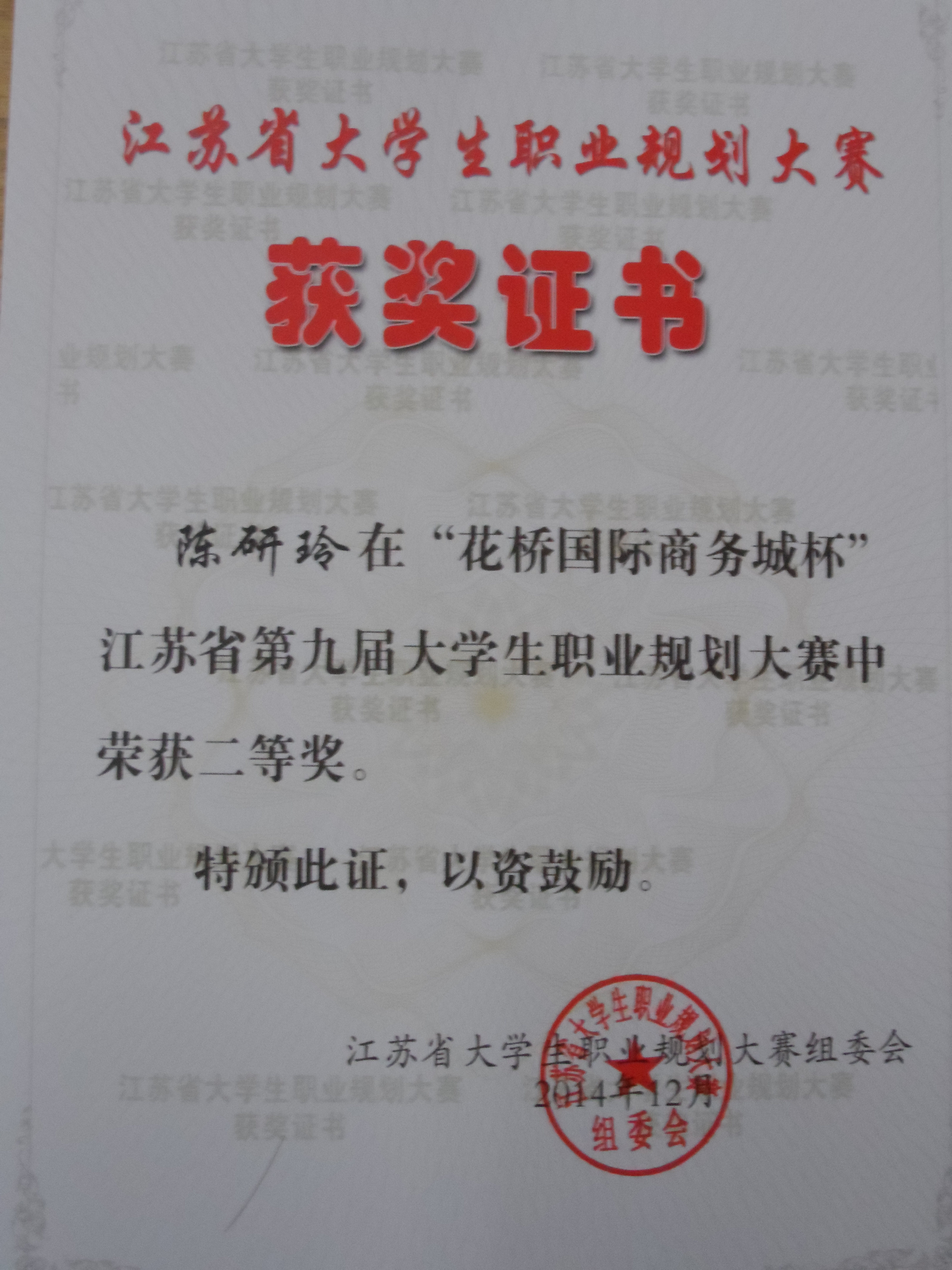 在刚刚结束的江苏省第九届老员工职业生涯规划大赛中,公司13营销与策划班员工陈研玲获得二等奖。