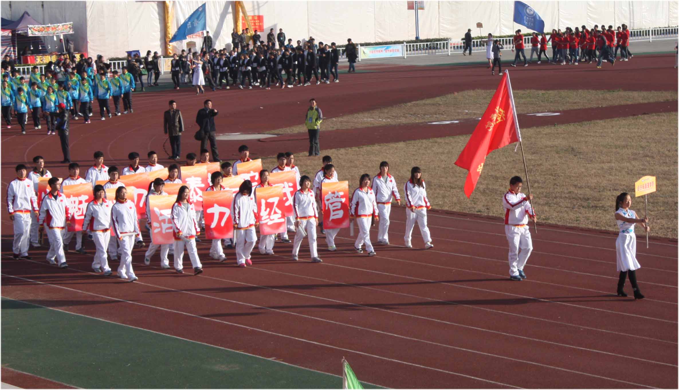 在11月13、14日举行的校第二届田径运动会暨教职工趣味运动会上,公司师生发扬拼搏精神,取得田径运动会男子甲组第三名、女子甲组第六名、教职工趣味运动会三等奖的好成绩。13会计2班陈航、14物流管理赵银银分别获得男子跳高、女子800M第一名、14电子商务陆寒松打破校运会男子跳远记录并获得第一名。
