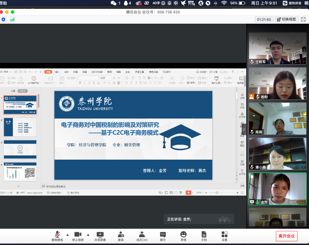 为确保线上答辩工作有效开展,公司本科毕业论文工作小组提前进行统筹规划,各答辩小组在答辩前开展软件调试和预演。在答辩过程中,每位员工利用屏幕共享技术展示PPT,从选题意义、文献综述、研究思路和方法等方面汇报论文开展情况,答辩小组教师进行点评、提问,并指出存在问题和修改建议。