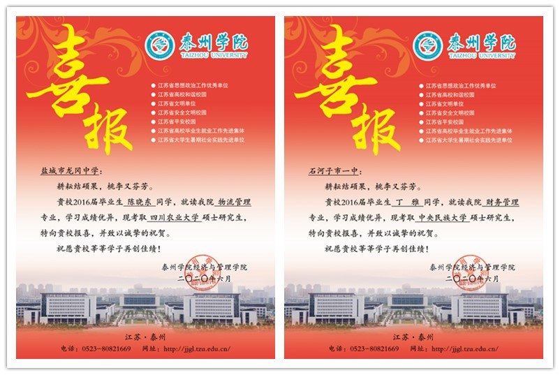 为扩大公司办学成效的影响力,公司制作了精美喜报,寄送至公司生源较集中的公司新疆石河子市一中、海安县实验中学、盐城市龙岗中学、南京市六十六中学等生源公司,为即将开始的高考招生做好准备,鼓励更多优秀学子报考公司。(BETVLCTOR伟德国际1946)