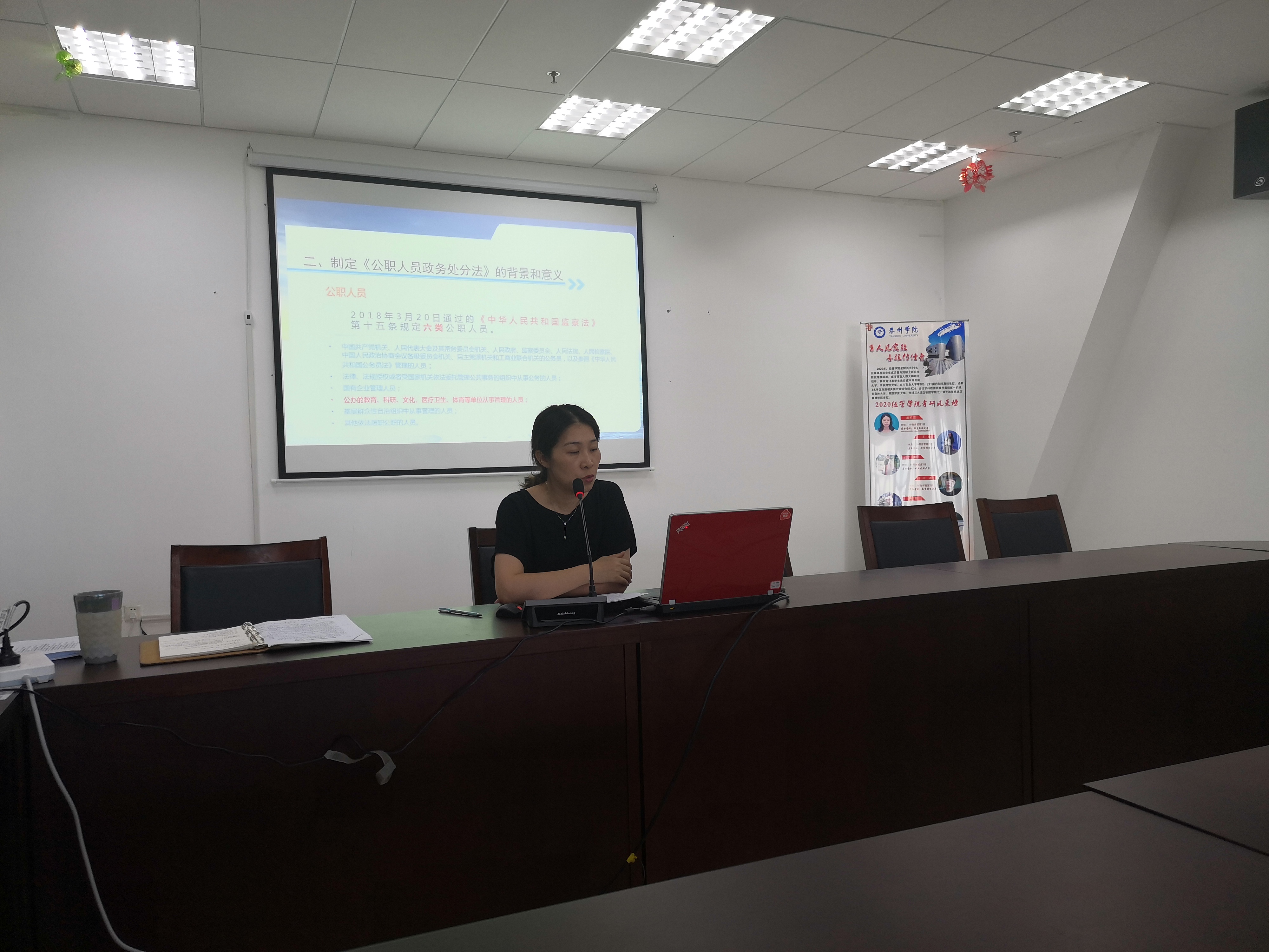 首先,公司党总支副书记邓淑梅带领大家共同学习了《中华人民共和国公职人员政务处分法》。邓淑梅从基本情况、制定的背景和意义和重点内容三个方面对《中华人民共和国公职人员政务处分法》进行了详细解读。同时运用近年来一些典型案例对政务处分法的十四条红线逐条梳理。邓淑梅要求大家在平时的工作中要明规矩、知敬畏、守底线,在迎评冲刺阶段更要做到听从指挥、齐心协力、全力以赴做好评估前的各项工作,确保高质量通过教育部本科教学工作合格评估。