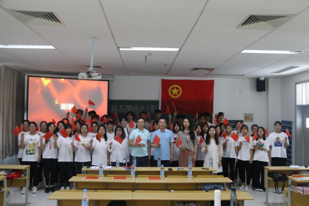 本次活动组织全班同学一起奏唱国歌、录制视频形式为祖国送上祝福,接着开展“我画你猜”的游戏,让同学们在游戏中了解共青团相关知识和国旗背后的故事。再由朱雨昕同学为大家分享自己的暑期返乡实践故事。最后,在《光荣啊,中国共青团》的歌声中,所有老师和同学们合影留念。