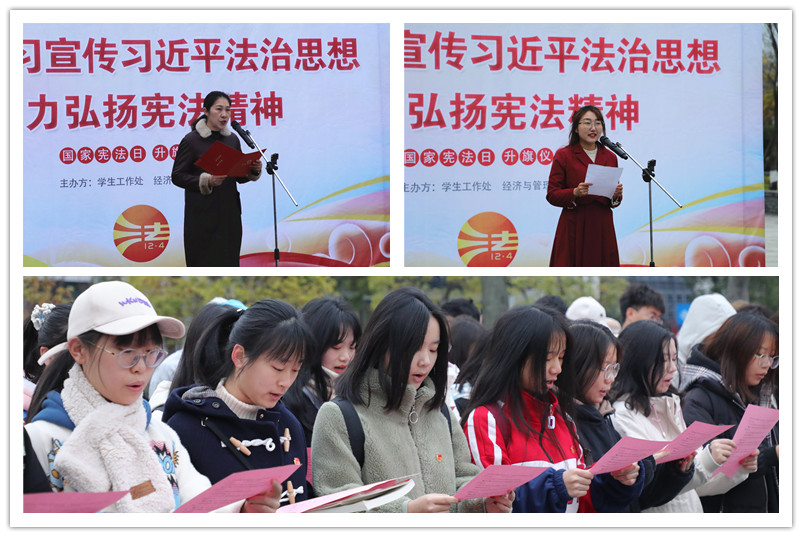 随后,院党总支副书记邓淑梅带领现场师生诵读了宪法部分条款,声音洪亮整齐,场面庄严肃穆,让师生切实感受了宪法的尊严。员工代表20财管2班的王怡萱,进行“青年自强,与法同行”的发言。号召同学们珍惜当下的学习时光,好好学习宪法精神。