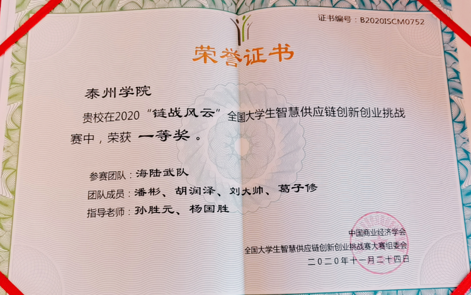 近日,“链战风云”2020年全国老员工智慧供应链创新创业挑战赛组委会传来喜报,公司孙胜元、杨国胜老师指导物流管理专业员工喜获本科组一等奖和二等奖各1项。其中,胡润泽、潘彬、刘大帅、葛子修同学获得1等奖,陈金纤、王亚楠、程晓晓同学获得2等奖。