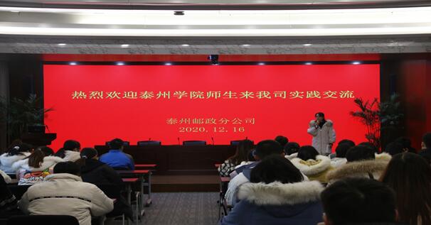 在邮政大楼会议室,泰州邮政市场营销部荀亚云总监给同学们做了邮政物流发展情况的报告,介绍了邮政物流发展历史及前景,邮政网络以及电商仓配库运营原理、邮政综合服务能力等,并与公司师生就邮政物流的运营问题进行深入交流和探讨。