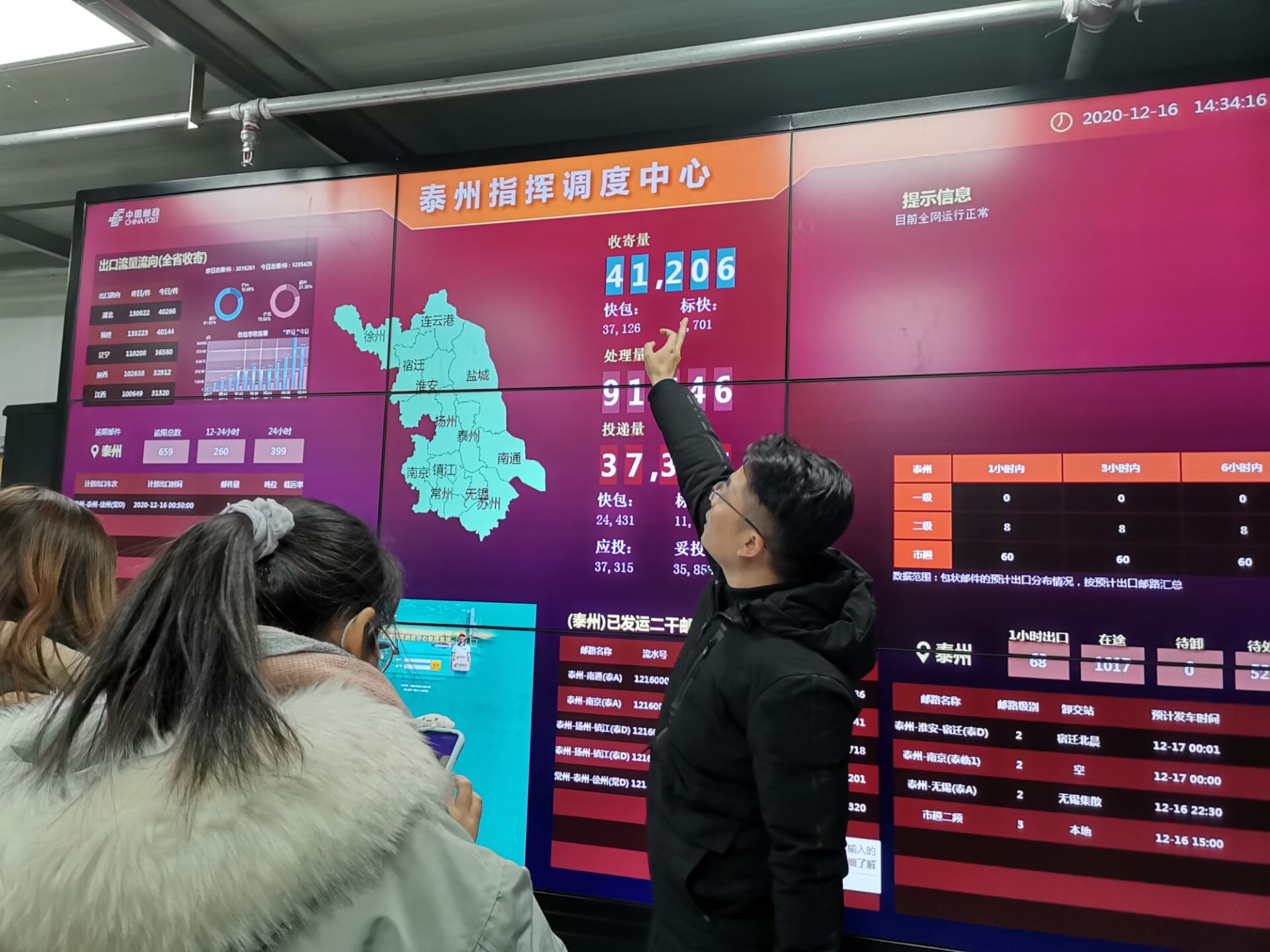 在云集仓库,张成红主任带领大家体验了整个库区的布局和运作流程。仓配中心主要设备为5层重型货架,高度7.8米,横梁最大承重能力可达1.5吨,70%的货品来自云集平台,主要为家居用品和母婴用品,分拣环节包括两个分拣工位,分别负责团购和杂单的商品复核、包装和贴面单作业,日处理量近10000件;网运中心主要进行快递和包裹的分拨,丁海乐主管给同学们介绍了货物分拨的流程,小件包裹自动分拣系统的运作原理以及其它设备;在指挥调度中心,巨幅显示屏不断跳跃着各类数据和图表,该中心能对整个泰州邮政物流系统进行指挥、调度,同时能适时监控整个邮政物流系统的运营状况,即时显示当日包裹收寄量、处理量和投递量等物流相关信息。