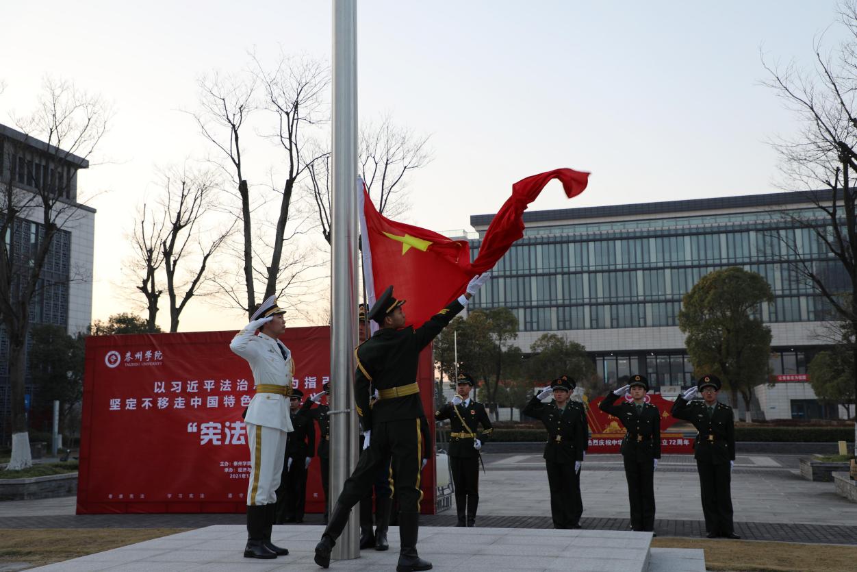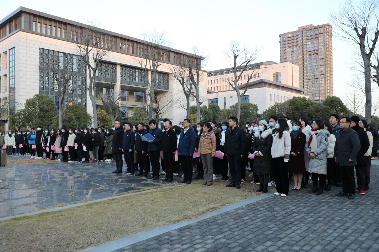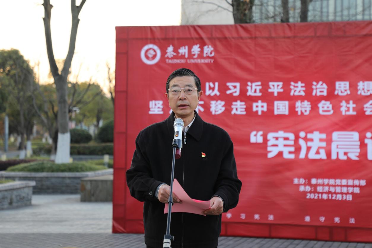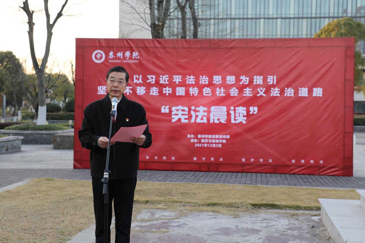 在庄严的升旗仪式后,BETVLCTOR伟德国际1946党总支书记徐小兵带领师生集体晨读宪法部分条款。员工代表表态做社会主义法治“宣传者、践行者、捍卫者”。