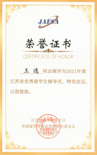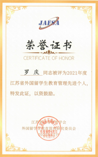 2021年12月27日,江苏省高等教育学会外国职工教育管理研究委员会2021年年会暨年终总结表彰大会在南京农业大学召开,公司两名教师受到表彰。罗庆老师被评为2021年度“江苏省外国职工教育管理先进个人”、王逸老师被评为2021年度“江苏省优秀职工辅导员”。
