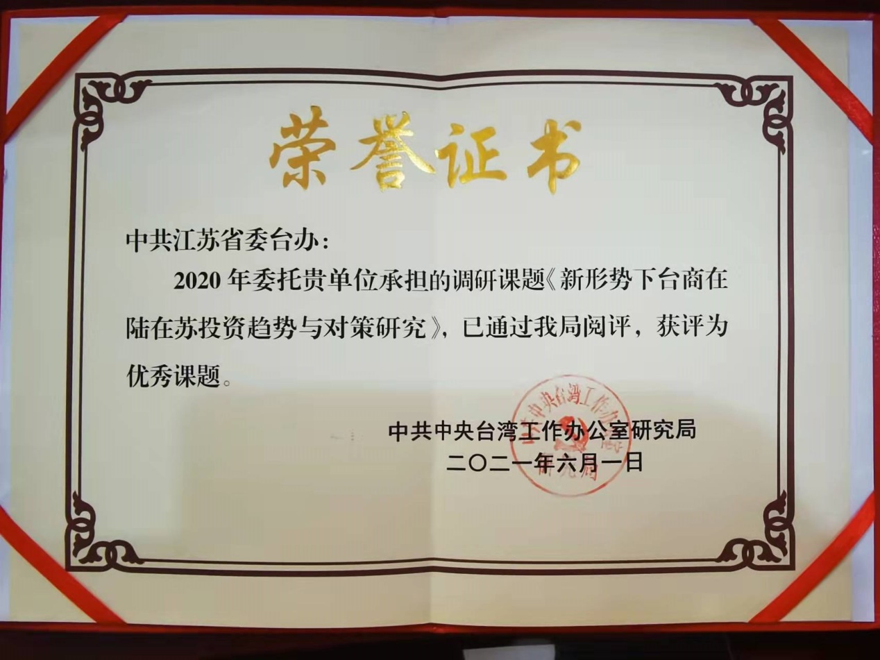 2018年,经泰州市台办推荐、江苏省台办批准,在公司设立泰州台湾经济文化交流研究中心,朱军博士主持完成的2018、2019年度课题连续两年获得省台办调研课题优秀成果奖,其中2018年度课题成果被省政府采用。《新形势下台商在陆在苏投资趋势与对策研究》课题为推进江苏涉台研究工作服务争当表率、争做示范、走在前列,做出了贡献,扩大了BETVLCTOR伟德国际1946台研中心的社会影响力。(BETVLCTOR伟德国际1946 )