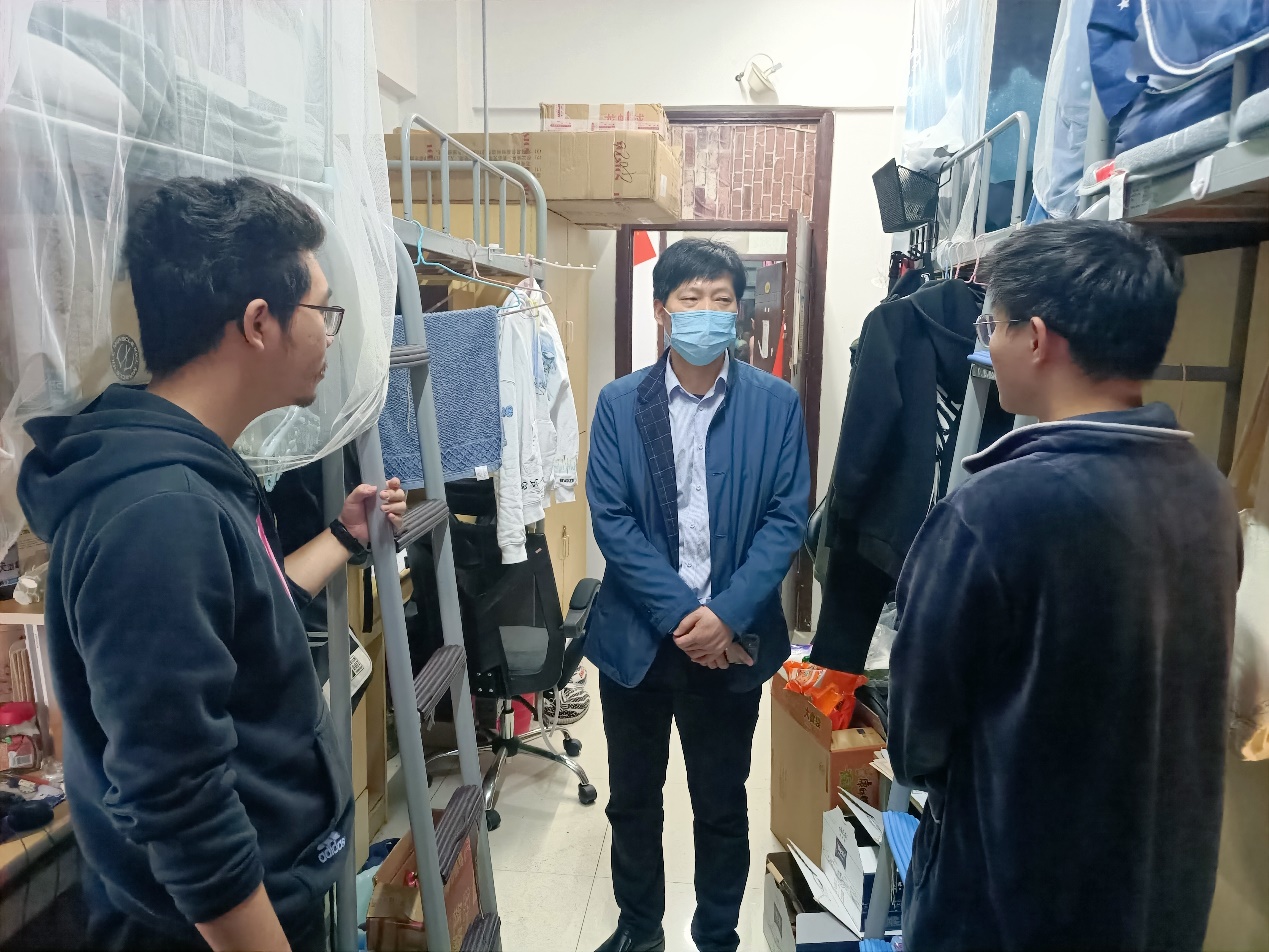 为了解疫情防控期间员工的思想、学习、生活等状况,4月20日晚,联系经济与管理公司员工班级的中层干部走访学生班级宿舍。公司党总支书记徐小兵、财务处处长于小萍、经管院副书记副院长刘荣江、校纪委办公室副主任王凯、校人事处副处长陈鹏参加了走访。