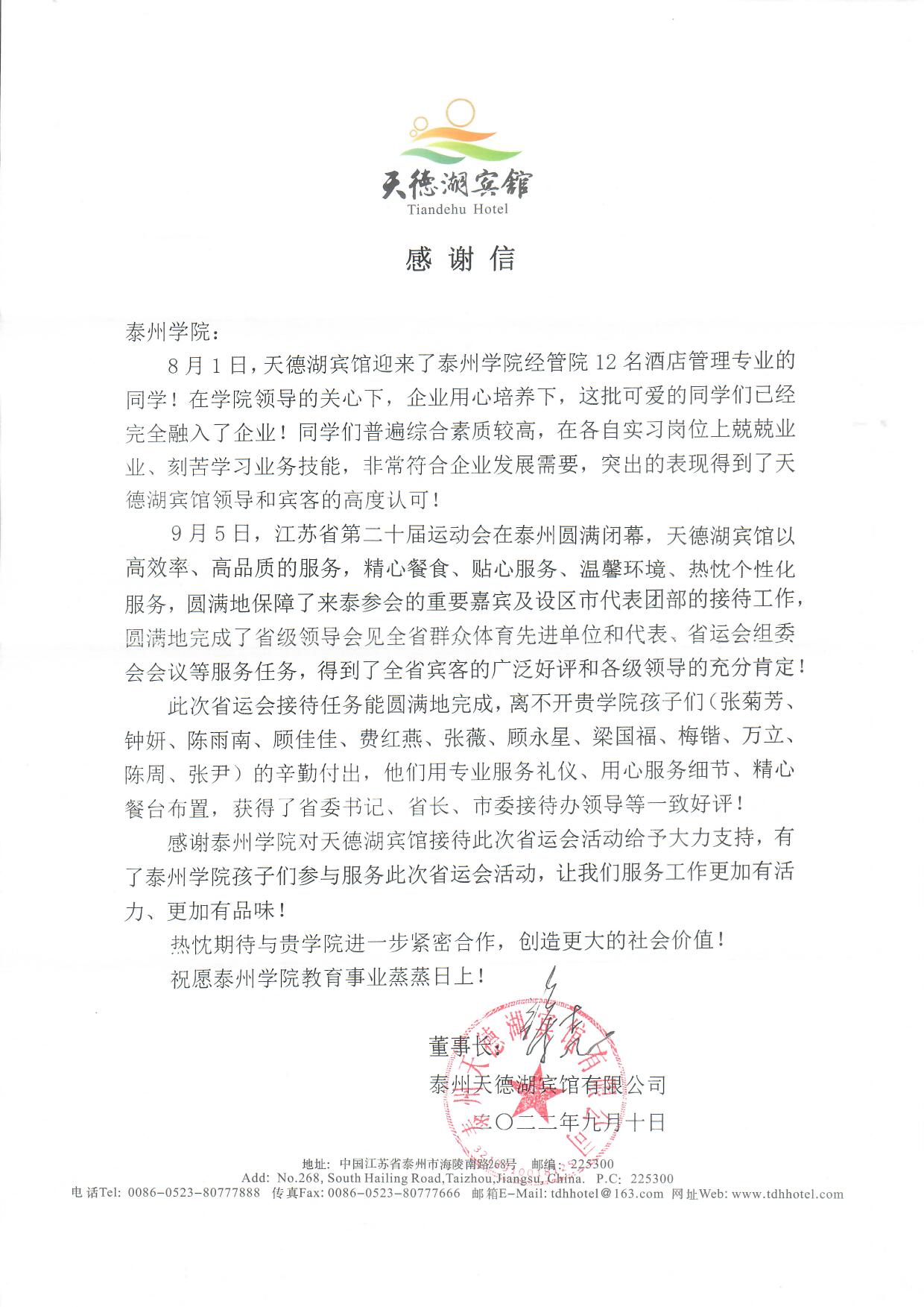 9月10号,泰州天德湖宾馆为BETVLCTOR伟德国际1946送上一封感谢信,对BETVLCTOR伟德国际1946旅游管理专业张菊芳、钟妍等12位同学高效率、高品质的服务表示由衷的肯定,对培养出优秀员工的BETVLCTOR伟德国际1946表示由衷的感谢!