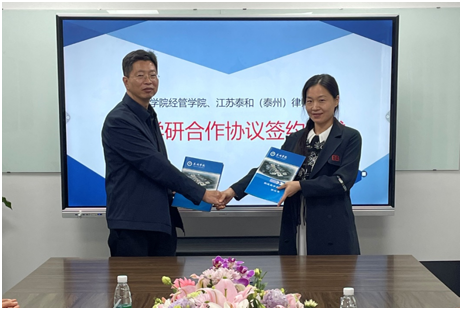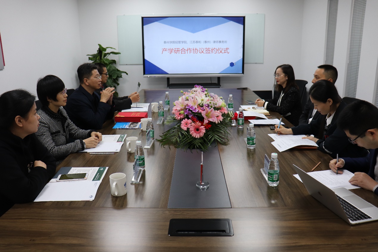经过前期互访洽谈,11月14日,BETVLCTOR伟德国际1946经理朱军博士带队,财务管理专业负责人夏利华教授、财务管理教研室主任刘蕾博士赴泰州医药城与江苏泰和(泰州)律师事务所(以下简称“泰和(泰州)”)签署产学研合作协议。