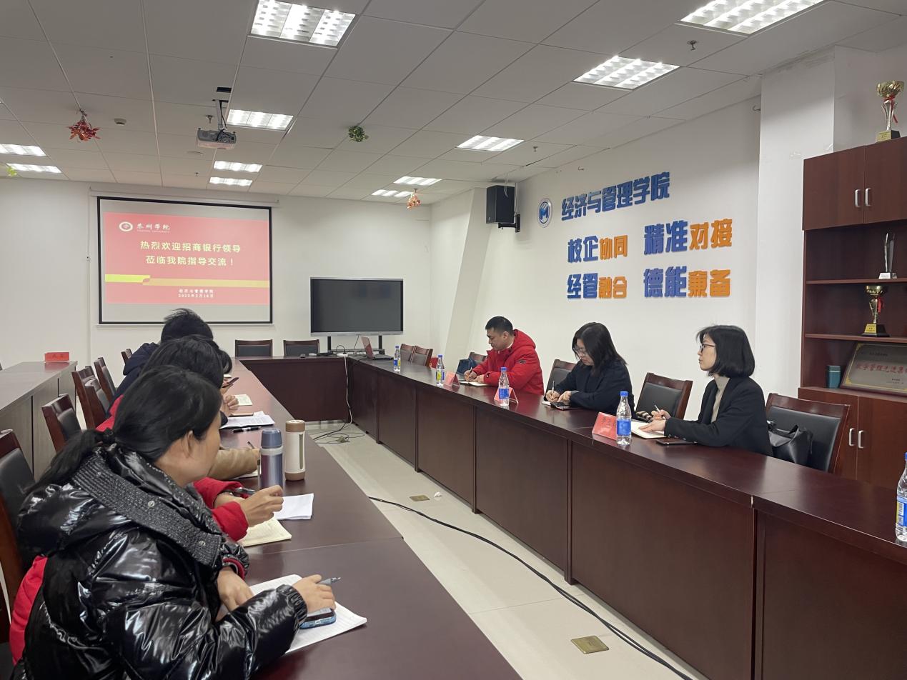 2月16日下午,招商银行南京分行人力资源部副总经理文柳、泰州分行综合管理部主任李兰娟一行来公司洽谈校企合作事宜。公司党总支书记徐小兵、副经理李露、校学工处副处长贺园亚及相关老师参加了会议。