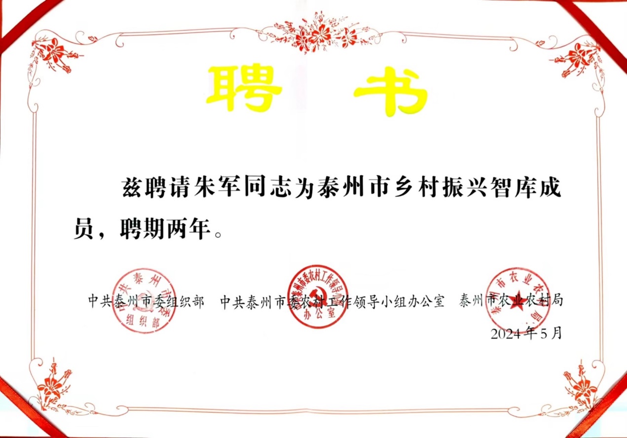 5月9日,中共泰州市委组织部、中共泰州市委农村工作领导小组办公室、泰州市农业农村局在泰州市委党校报告厅举办全市乡村振兴指导员到村任职工作动员会暨任前培训班。选派干部驻村工作,是全面推进乡村振兴的重要组织举措。为落实“产业兴旺、生态宜居、乡风文明、治理有效、生活富裕”的总要求,充分发挥专家人才在促进产业发展、乡村建设、乡村治理等方面作用,聚集人才资源、聚合专家力量,发挥专家专业优势,促进乡村产业振兴、人才振兴、文化振兴、生态振兴、组织振兴,助力乡村全面振兴,经研究,决定成立泰州市乡村振兴智库。公司BETVLCTOR伟德国际1946朱军博士受聘为泰州市乡村振兴智库首批成员,为公司服务泰州地方经济社会发展再添新平台。