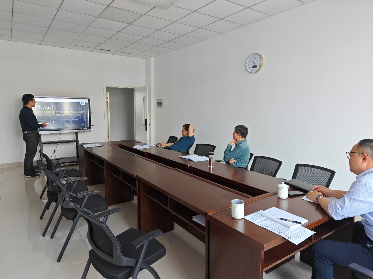 交流会中,来自浙江工商大学的白伟博士发表了关于《组织间依赖视角下产业链多层次感知风险分析——基于BERT模型的深度学习方法研究》的学术演讲。白伟博士详细介绍了感知风险、BERT模型-词向量模型的改进等内容。另外,与会教师围绕如何进一步区分产业内不同企业的风险差异等内容也展开了进一步讨论。