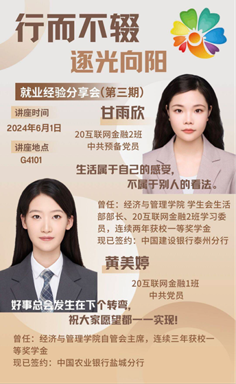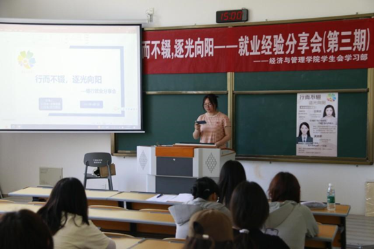 为了帮助同学们更好地了解就业环境,提升就业竞争力,6月1日,BETVLCTOR伟德国际1946员工会学习部在教学楼G4101举办“行而不辍,逐光向阳”——就业经验分享会(第三期),并邀请到20互联网金融1班的黄美婷同学和20互联网金融2班的甘雨欣同学分享她们的就业经历,为经管学子们提供宝贵的经验。
