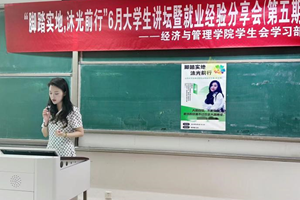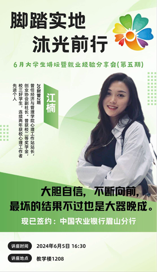 近年来,人工智能迅猛发展,就业形势日益紧张,为了帮助同学们更好地确定就业方向,缓解就业焦虑,公司学习部特此在6月5日下午4:30于教学楼A1208举办“脚踏实地,沐光前行”6月老员工讲坛暨就业经验分享会(第五期),并邀请20财务管理2班的江楠同学进行就业经验分享。