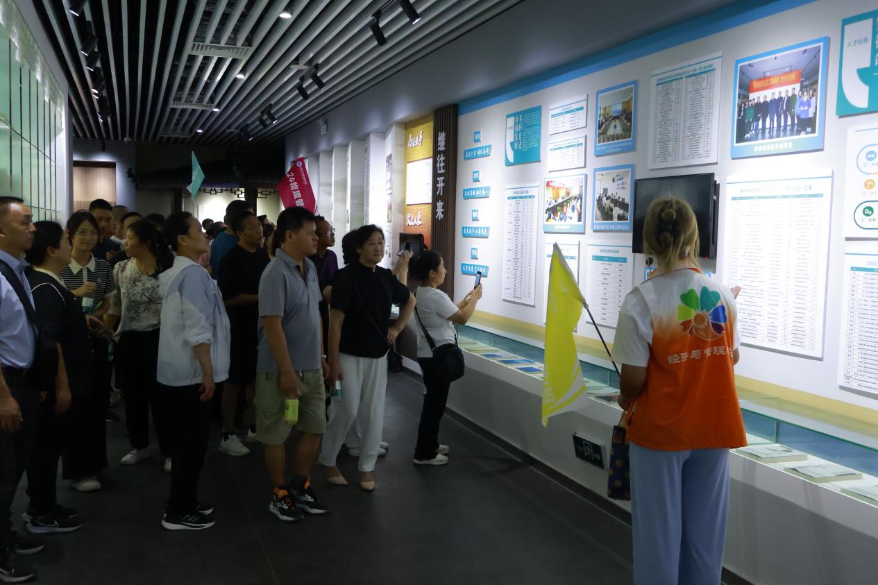 会议结束,公司分别组织7路纵队带领新生家长依次经过校行政楼、宿舍生活区、图书馆、校史馆、教学楼和院办公楼等区域游览公司,熟悉校园环境。