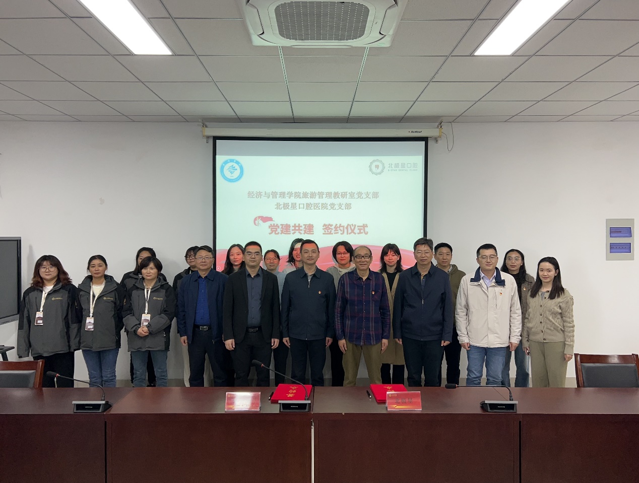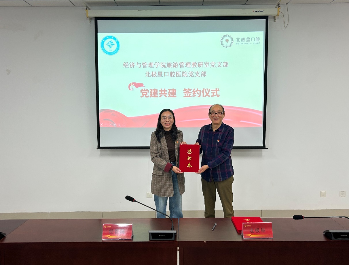 旅游管理教研室党支部书记宋欢和北极星口腔医公司党支部书记李荣共同签署了党建共建协议,双方共同表示,将围绕“大健康”主题,通过党建引领,共同推动医疗、教育领域的深度合作,以实现资源共享、优势互补,打开院医党建和医管融合新局面。